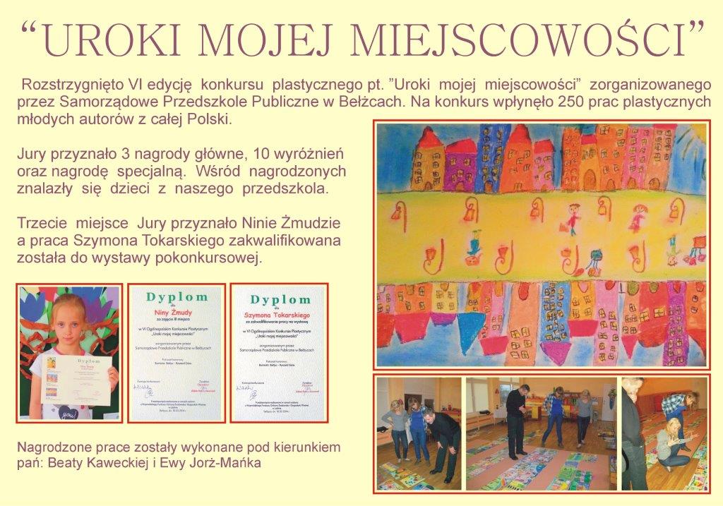 III miejsce Niny Żmudy w VI Ogólnopolskim Konkursie Plastycznym pt.: "Uroki mojej miejscowości" Na konkurs wpłynęło 250 prac z przedszkoli z całej Polski, przyznano jedną nagrodę specjalną oraz 3 nagrody główne i 10 wyróżnień. Ponadto jury zakwalifikowało 33 prace na wystawę pokonkursową . Nagrodzeni z naszego przedszkola to Nina Żmuda III- miejsce oraz Szymon Tokarski- zakwalifikowany do wystawy pokonkursowej.